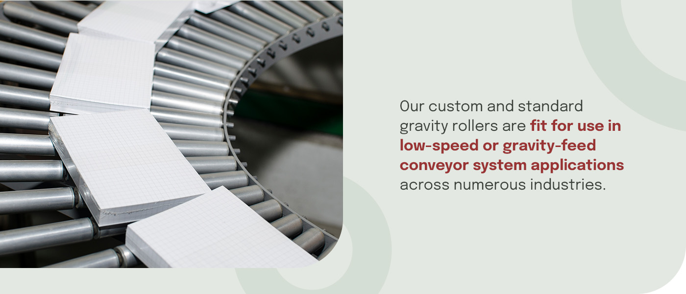 Our custom and standard gravity rollers are fit for use in low-speed or gravity-feed conveyor system applications across numerous industries. They’re suitable for helping transport small and large boxes, crates, pallets and tote boxes. Some of the industries where gravity rollers might be ideal include: